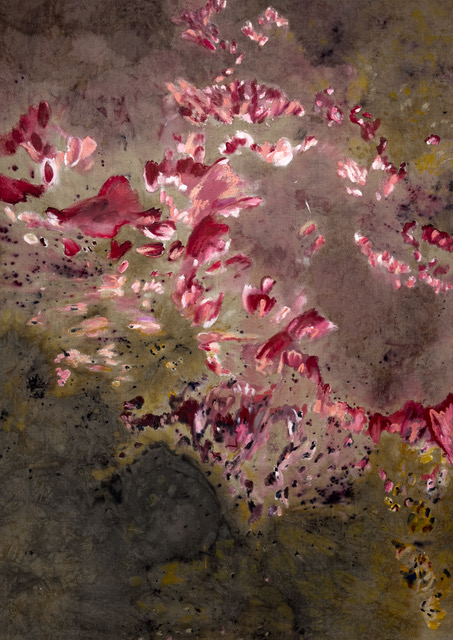 Moria hanteert een arbeidsintensieve, tactiele aanpak. Zij bereidt natuurlijke pigmenten uit lokaal verzamelde en gedroogde bloemen, bladeren, schimmels etc., waarmee transparante kleurstoffen op het canvas worden overgebracht. Via stoomtechniek voor de wat vastere organische materialen ontstaan weer andere tinten. En tenslotte geeft olieverf de meer stevige kleuraccenten.