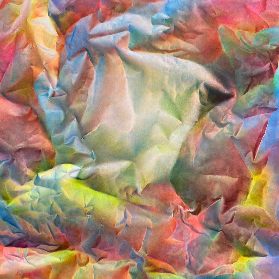 Haar eerste handeling tot een kunstwerk is het willekeurig opvouwen, opzettelijk kreuken, ja frommelen van het canvas. De resulterende licht-donker schakeringen inspireren haar om een eerste kleur aan te brengen met sprankelende spuitverf. Met slechts enkele andere kleuren herhaalt zij deze stap, zodat ook vanzelf de mengkleuren ontstaan. Tenslotte wordt het doek strak gespannen op een stevig aluminium frame.