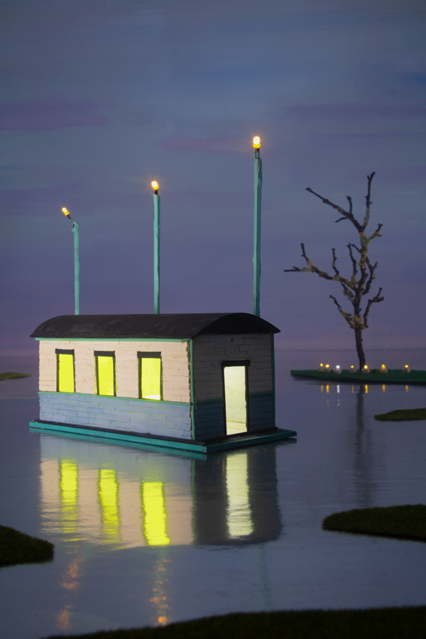 In the photographic work of Lisanne Hoogerwerf we see lonely places, strange landscapes or desolate events. Surprisingly, thanks to the lighting and the use of colour, the atmosphere is not unpleasant. Rather, it arouses the curiosity to investigate what you see: e.g., a high structure with a tent cloth on an empty, demarcated field, where a concert may have just been going on that has ended abruptly, or a party where no one came. Lisanne Hoogerwerf graduated as a painter, but after a while she found photography more suitable to express herself in. She first makes models using all kinds of materials such as wood, sand, glue or paper. She uses paint and chalk to give colour and create atmosphere. She instinctively knows how to build up an image, e.g., by dramatically positioning an object or contrasting it with the background. Hoogerwerf uses exciting compositions in her landscapes. And her colour combinations look attractive, almost picturesque. In this way she constructs her scenes before a photo is taken of the result.