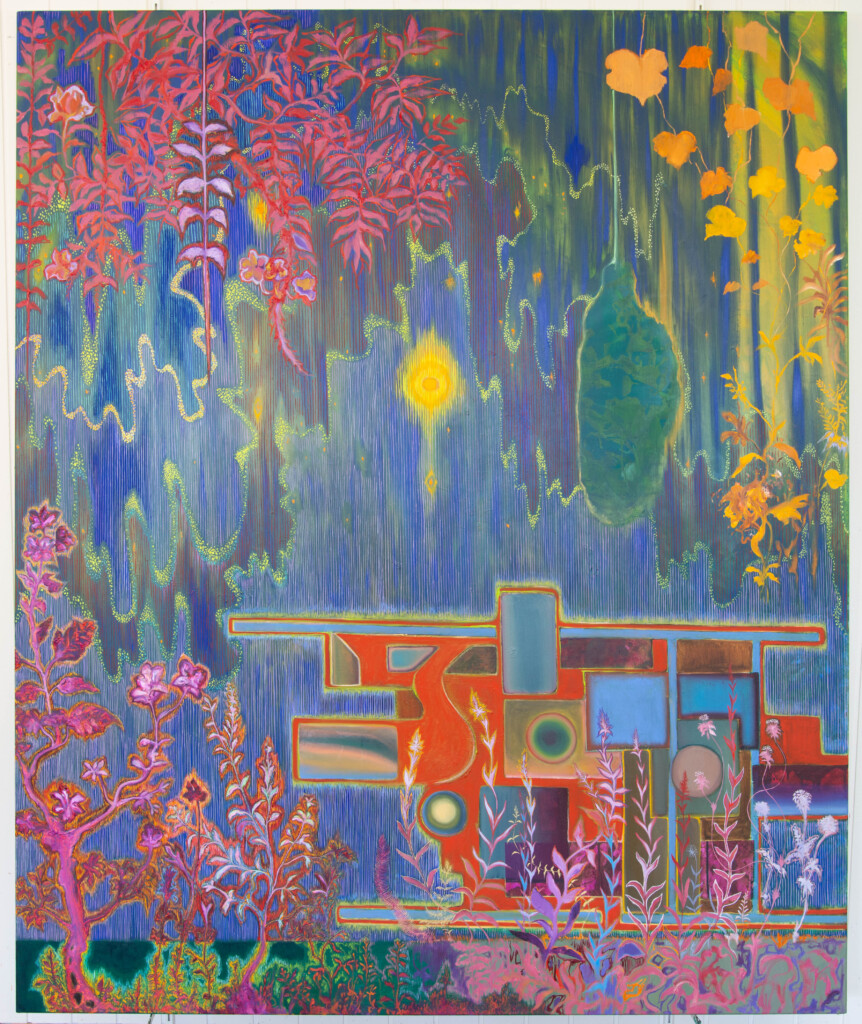 Bas Wiegmink paints with many contrasts in an exuberant, romantic colour palette, sometimes even fluorescent. His cinematic and free way of painting makes viewing permanently interesting. In his earlier work, trees and plants grow wild between buildings. Exuberant flora has taken up all the space there, sometimes with remains of human life. In Wiegmink’s new paintings, the flora remains present with powerful, convincing touches and in intense colours, but nature undergoes an apparent order. She now floats, as it were caught in an all-encompassing grid, in all kinds of changing infinite structures. Like an escapist, he examines the form in order to be able to constantly renew itself, a contrast that betrays the ambiguity of reality.
