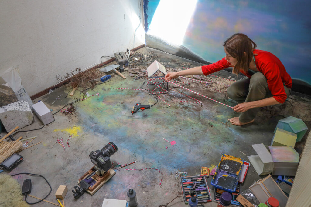 She first makes models using all kinds of materials such as wood, sand, glue or paper. She uses paint and chalk to give colour and create atmosphere. She instinctively knows how to build up an image, e.g., by dramatically positioning an object or contrasting it with the background. Hoogerwerf uses exciting compositions in her landscapes. And her colour combinations look attractive. In this way she constructs her scenes before a photo is taken of the result.