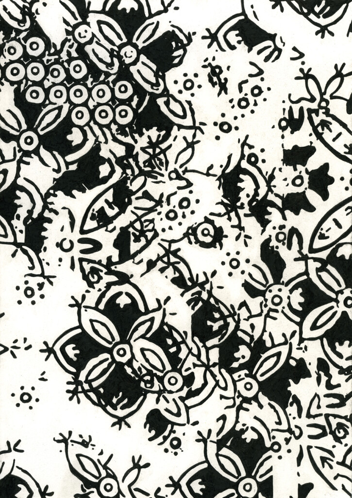 The drawings from the series ‘samplebook pages’ are based on reworked and remixed patterns and motives from the cloth sample books of the Leidsche Katoen Maatschappij (De Helder & Co.) and Firma Haykens & Co. fromthe 19th/early 20th century (from the collection of Museum De Lakenhal, Leiden).
