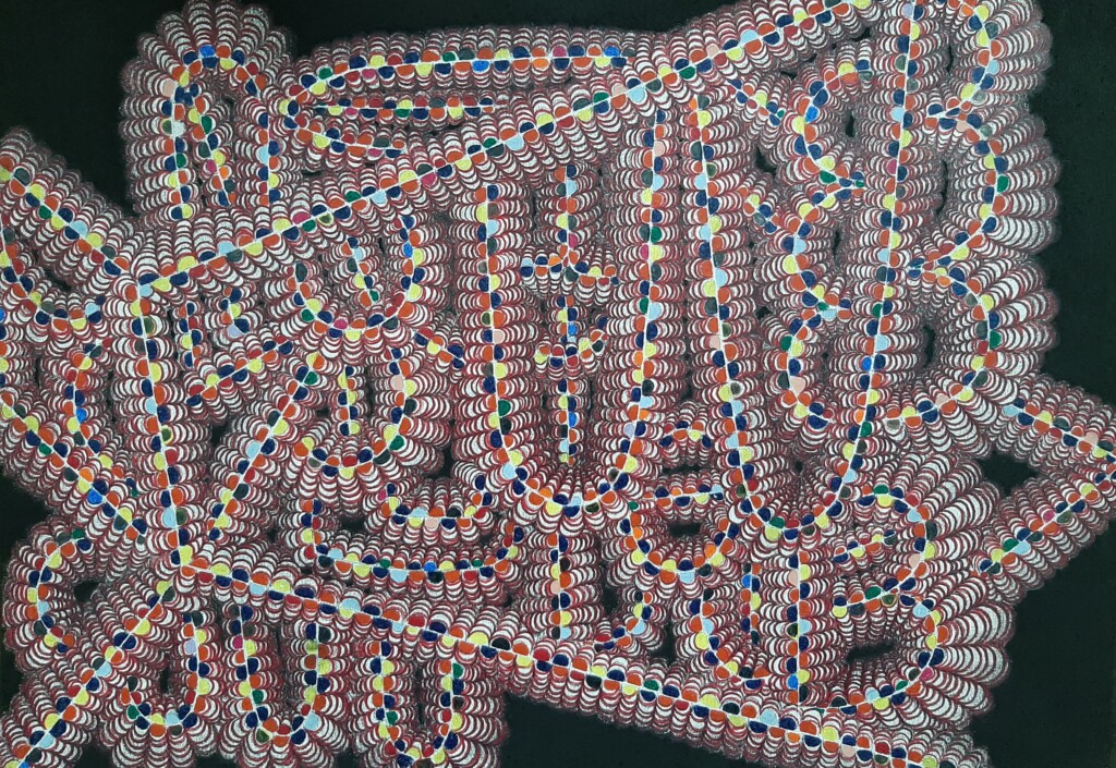 Sigrid van Woudenberg works associatively with paper, Siberian chalk and pencil. Her new works show repeating, colourful patterns with many curves and shadows. The fascinating shapes resemble a string of tissues, which seem to vibrate, to breathe like living organisms. They are vague and at the same time cheerful. They appear to be larger than they are. With her drawings, Van Woudenberg conjures up the world to her own fantasy with titles such as: ‘Our House has different Shadows’, ‘Time a Thief’ and ‘Lust for life’.