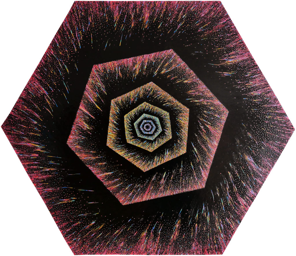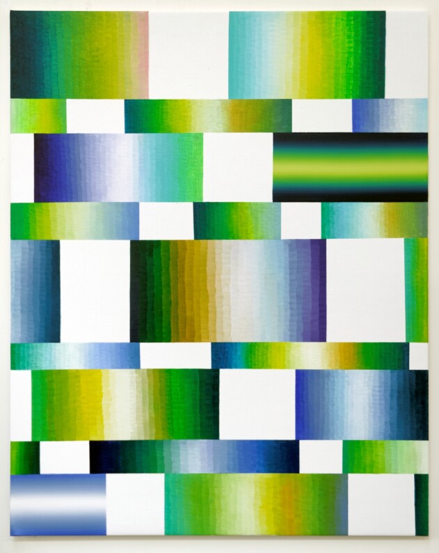 Inez Smit (1967) begint met een eerste opzet, dat tijdens het verdere proces steeds onderbroken wordt door een nieuw uitgangspunt, waarbij de weerslag van het vorige zichtbaar blijft. In een afwijkende vorm, lijndikte of kleur, lijkt het ‘patroon’ te worden voortgezet met een andere insteek. De resulterende ordening komt niet voort uit een vooropgezet plan, maar uit het schilderproces zelf.