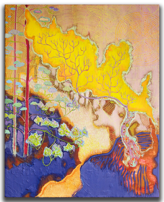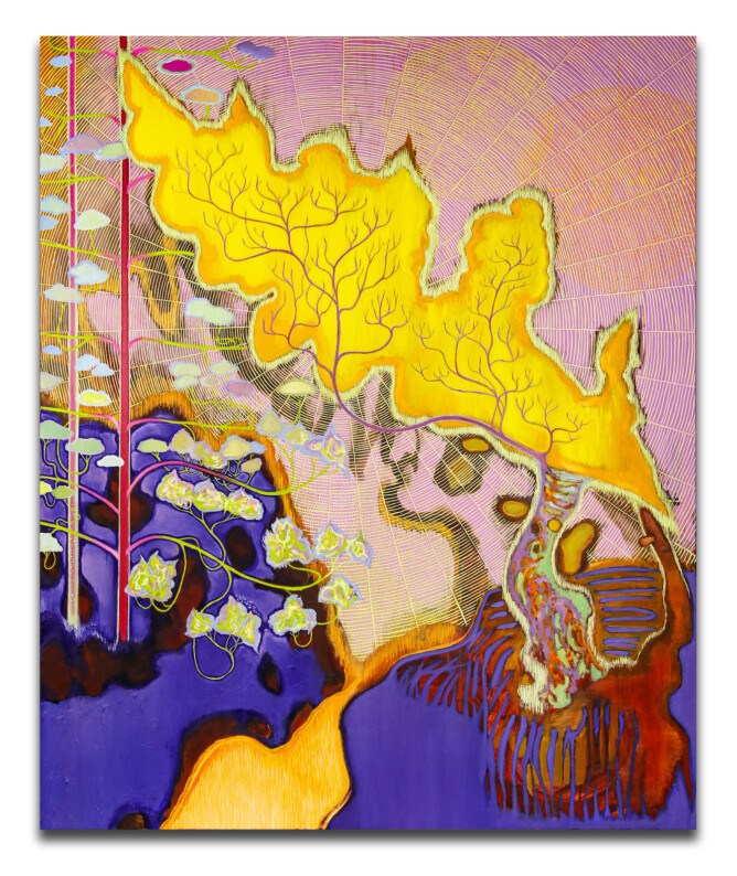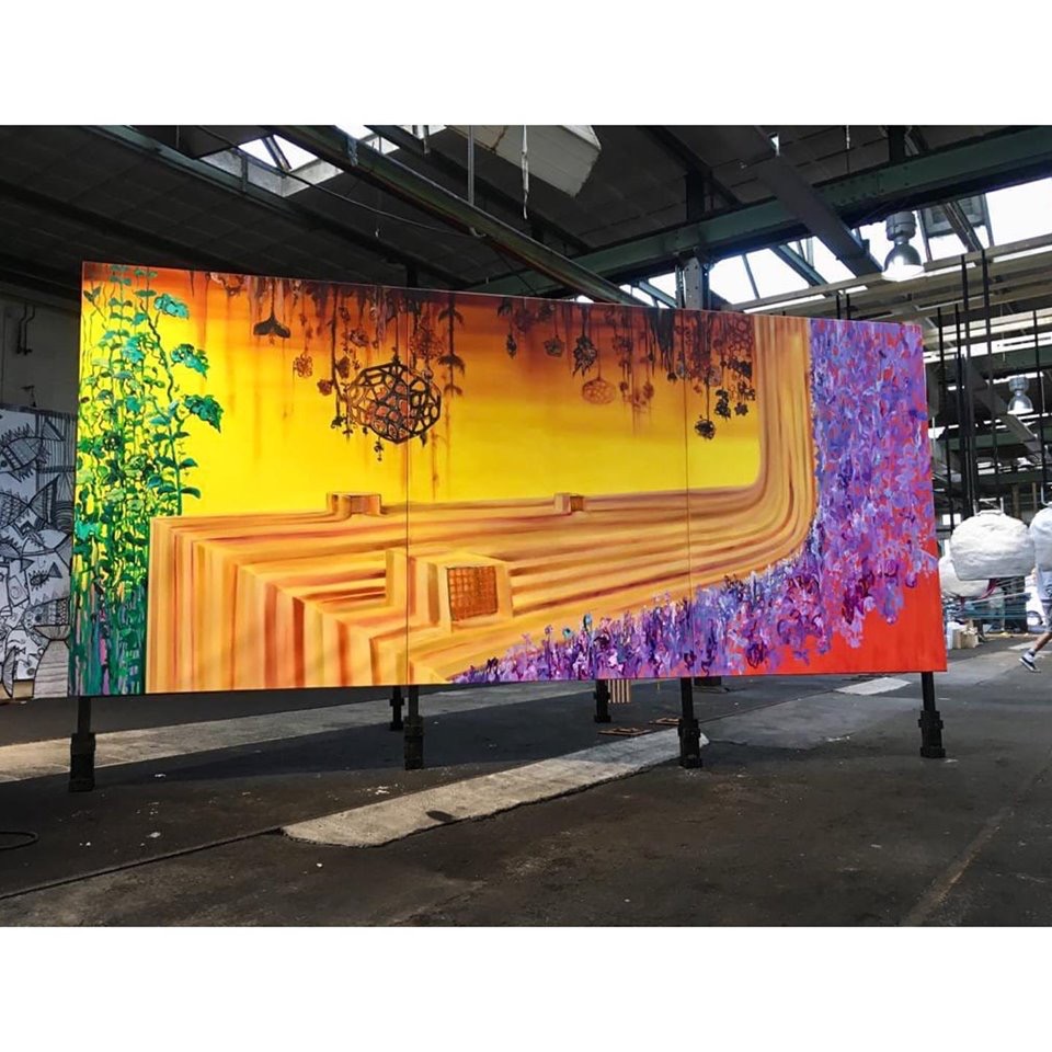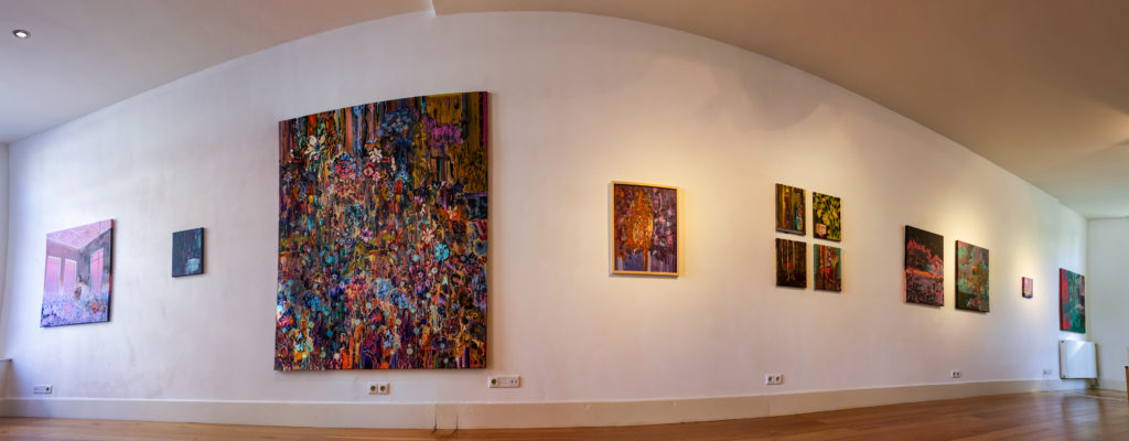 Bas Wiegmink schildert met veel contrasten in een uitbundig romantisch kleurenpalet, soms zelfs fluorescerend. De filmische en dromerige manier van schilderen maakt het kijken interessant. Bomen en planten groeien wild tussen gebouwen door. De uitbundige flora heeft alle ruimte ingenomen, soms zie je ook resten van menselijk leven. Wat gebeurt hier?