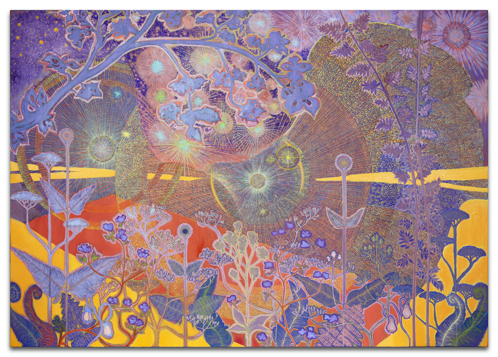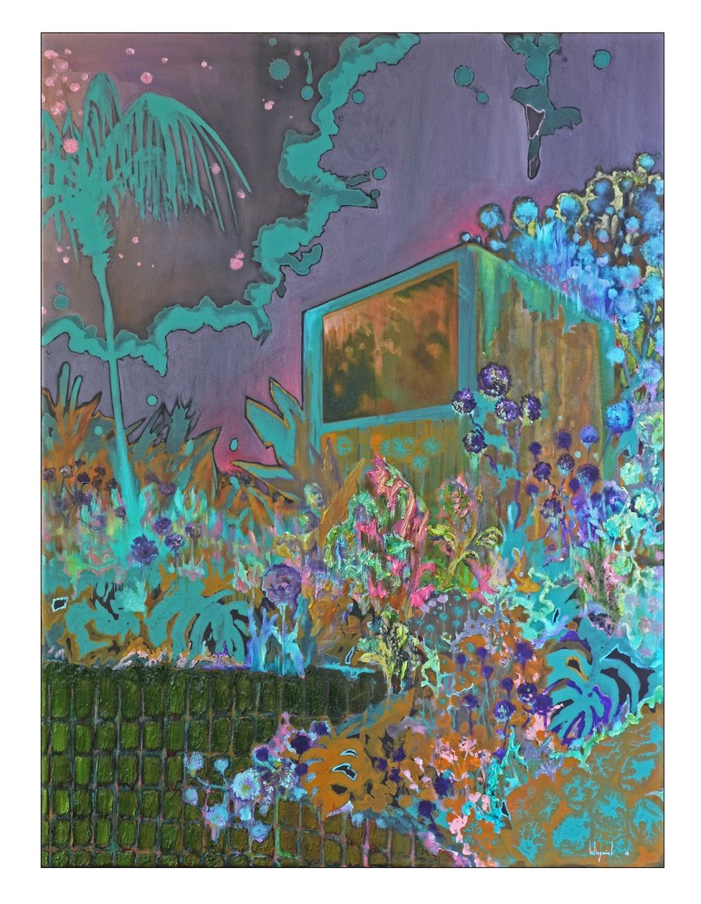 Op de achtergrond zien we moderne gebouwen in dunne contouren geschilderd, alsof ze verlaten zijn of wegkwijnen. Aan de voorkant tiert welig de flora met krachtige overtuigende toetsen in heftige kleuren. Dit contrast verraadt de dubbelzinnigheid van de werkelijkheid: een waarschuwing of juist een optimistisch Arcadië.