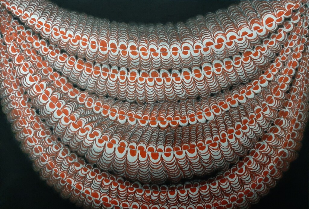 Sigrid van Woudenberg werkt associatief met papier, Siberisch krijt en potlood. In deze nieuwe werken tonen herhalende, kleurrijke patronen met veel rondingen en schaduwwerking. De fascinerende vormen lijken op een aaneenrijging van weefsels, die schijnen te vibreren, te ademen als levende organismen. Ze zijn onbestemd en tegelijkertijd ook vrolijk makend. Qua afmeting doen ze zich groter voor dan ze zijn. Van Woudenberg tovert met haar tekeningen de wereld naar haar eigen fantasie met titels als: ‘Our House has different Shadows’, ‘Time a Thief’ en ‘Lust for life’.